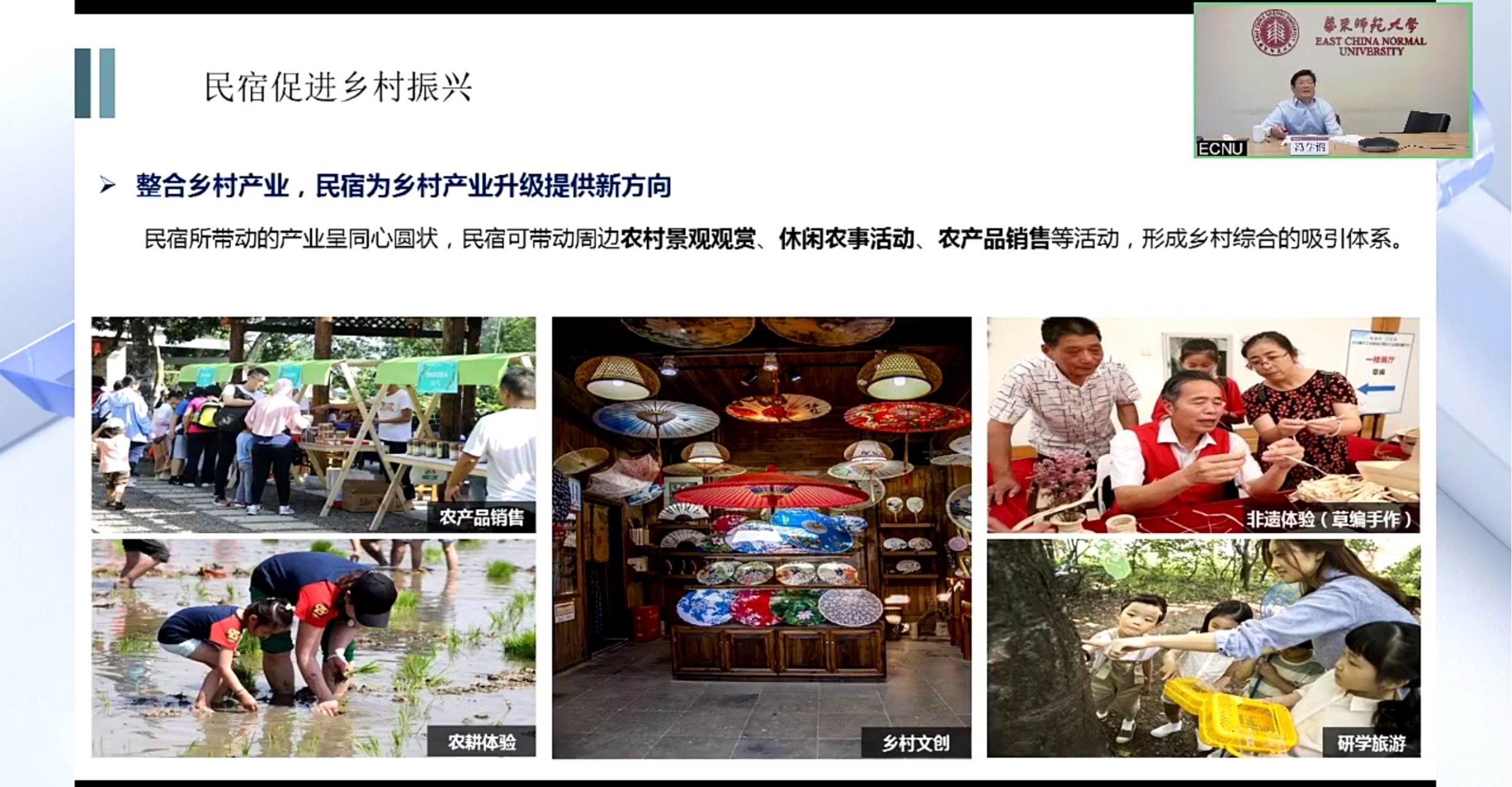 受高校教育帮扶联盟秘书处委托,在教育部发展规划司指导下,10月13日下午,高校教育帮扶联盟“乡村振兴大讲堂”第4讲在华东师大举行。我校经济与管理学部教授、博士生导师,上海长三角旅游发展研究中心主任冯学钢作《民宿发展与乡村振兴》报告。报告以视频直播形式开展,来自教育部有关部门、兄弟高校、部属高校帮扶地区等单位2000余人观看直播。经济与管理学部教授、博士生导师,上海长三角旅游发展研究中心主任冯学钢作《...