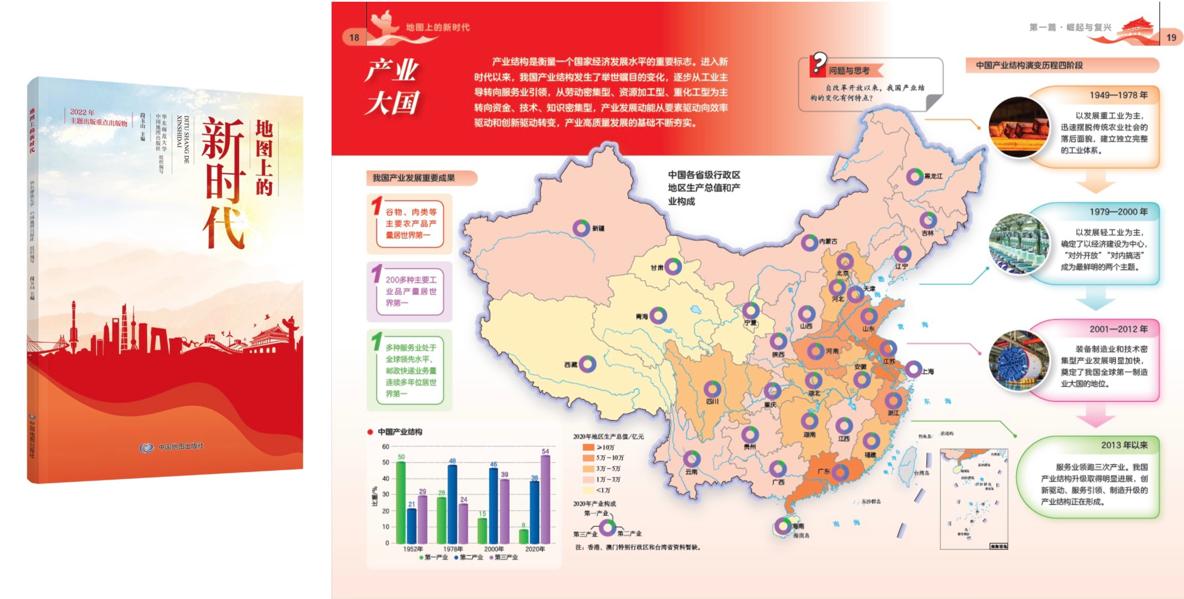 近日,由自然资源部选送、中国地图出版集团联合3245澳门新莆京共同策划编写的中宣部主题出版重点出版物《地图上的新时代》正式出版发行。本书紧密围绕宣传贯彻落实党的二十大精神主线,以地图为载体多角度、全景式地呈现新时代十年发生的伟大变革和历史成就,激扬奋进新征程、建功新时代的蓬勃力量。 全书共分为“可爱的中国”“崛起与复兴”“安康中国”“美丽中国”“智慧中国”“重大工程”“筑梦中国”等7个篇章48...