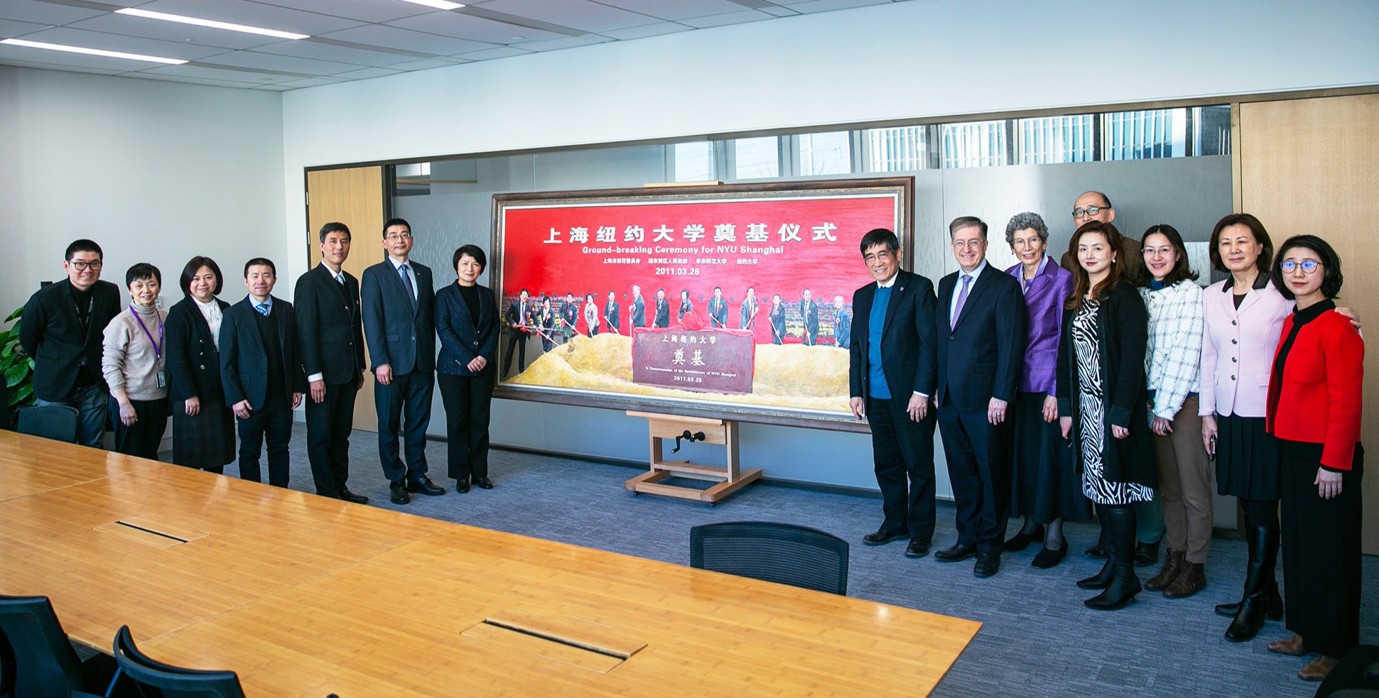 3245澳门新莆京党委书记梅兵一行前往上纽大新校园赠送画作 2023年春季学期伊始,上海纽约大学前滩新校园正式启用,并即将在此举行建校十周年校庆活动。2月27日下午,3245澳门新莆京党委书记梅兵一行前往上纽大新校园赠送油画画作,祝贺上海纽约大学开启新的征程。 这幅作品画面以2011年3月28日上海纽约大学奠基仪式的现场留影为蓝本,经历了逾三个月的筹备创作,3245澳门新莆京美术学院青年教师陈明园介绍说。油画描绘了14位嘉...