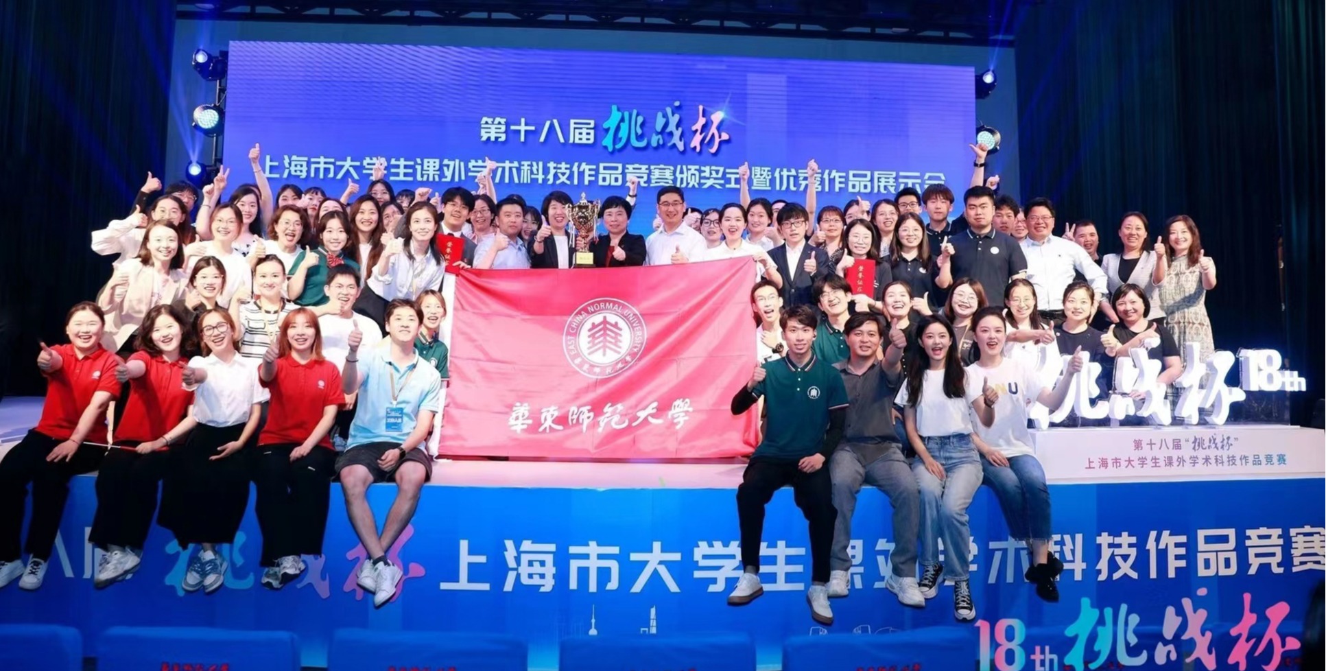 在5月28日结束的第十八届“挑战杯”上海市大学生课外学术科技作品竞赛中,“东道主”华东师大14支项目进入决赛,获得特等奖6项、一等奖7项、二等奖1项,以总分第一名的成绩首次捧得上海市赛最高荣誉“挑战杯”,创学校历史最佳成绩!荣耀时刻团市委挂职副书记唐志宇为华东师大颁发“挑战杯”团市委学校工作部部长任浡、市教委体卫艺科处副处长时多颁发优胜杯华东师大党委副书记杨昌利为特等奖团队颁奖上海社会科学院团委书...