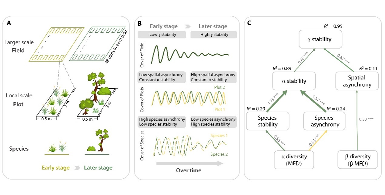 演替理论是植被生态学研究的核心问题,也是指导退化生态系统恢复的关键理论,被认为是解决当代人类环境危机的基础。经典演替理论认为,随着演替的进程,生态系统的稳定性逐渐提高。这一观点被广泛写入生态学教科书中,并已成为生态恢复的指导思想。但是,针对这一观点的长期实证研究依旧十分缺乏。 10月6日,华东师大生态与环境科学学院黎绍鹏教授团队领衔在 Science Advances 杂志在线发表题为 Scale-dependent changes...