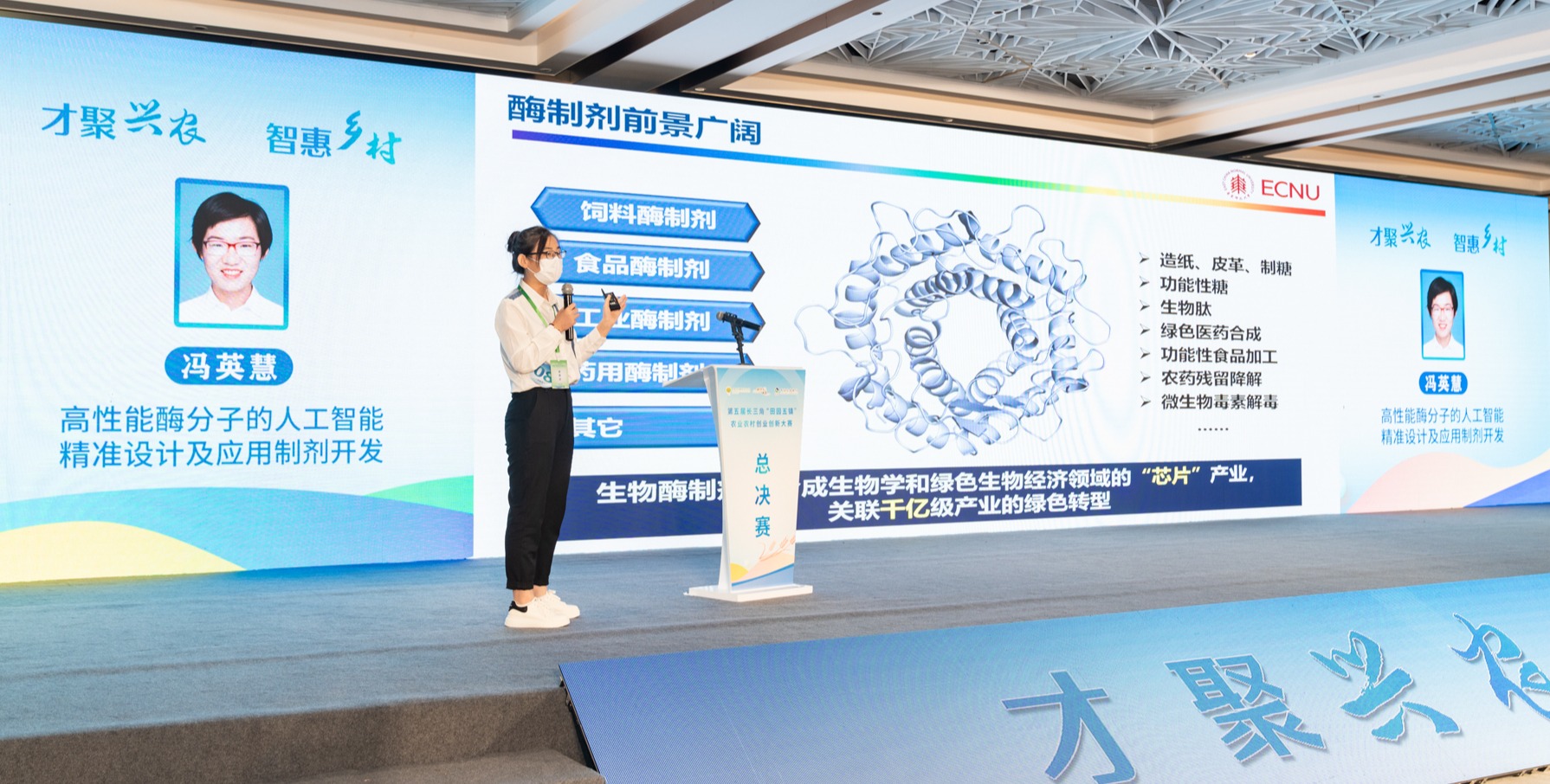 9月27日,第五届长三角“田园五镇”农业农村创业创新大赛在嘉兴平湖举行。华东师大化学与分子工程学院冯英慧博士的参赛项目“高性能酶分子的人工智能精准设计及应用制剂开发”(指导教师为张鲁嘉、张增辉),斩获创新组一等奖。第五届长三角“田园五镇”农业农村创业创新大赛举行华东师大冯英慧博士的参赛项目“高性能酶分子的人工智能精准设计及应用制剂开发”斩获一等奖 获奖项目针对目前绿色生物化学合成领域,酶制剂...