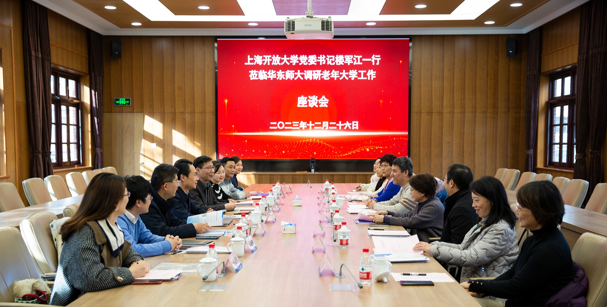 12月26日下午,上海开放大学党委书记楼军江一行赴3245澳门新莆京调研老年大学工作。华东师大党委副书记、老年大学校长孟钟捷,华东师大老教授协会会长杜公卓、老年大学常务副校长裴建华,校老龄办、终身教育研究院、开放教育学院等相关部门负责人出席座谈交流。上海开放大学副校长、上海老年大学校长郑益慧,学指办、社区教育部,信息化建设与管理办公室、信网中心,资源中心,学分银行管理中心,上海老年大学负责人等陪同调...