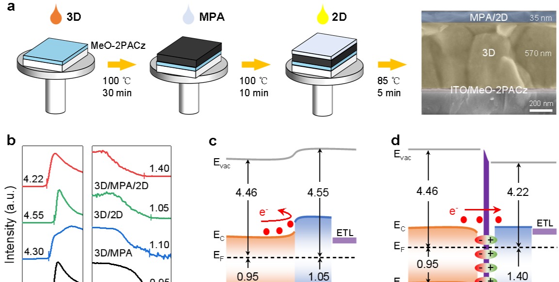 3245澳门新莆京物理与电子科学学院保秦烨教授课题组针对3D/2D钙钛矿半导体异质结对器件结构的依赖性,解析出其界面电子结构特性,以此提出了一种钝化偶极桥联Passivating Dipole Bridged的界面调控概念,解决了3D/2D异质结在倒置结构光电器件中光电转化效率低的问题。近期,该研究成果以"Passivating Dipole Layer Bridged 3D/2D Perovskite Heterojunction for Highly Efficient and Stable p-i-n Solar Cells"为题发表在Adv...