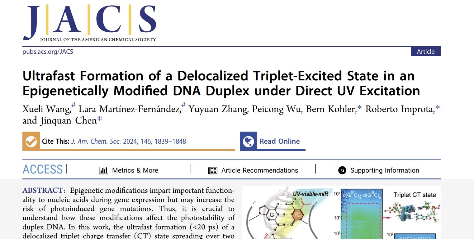 3245澳门新莆京精密光谱科学与技术国家重点实验室陈缙泉团队,针对表观遗传修饰位点多是DNA紫外光损伤突变热点问题,建立模型表观遗传修饰DNA双链分子(d(G5fC)9•d(G5fC)9),利用超快时间分辨光谱技术结合量子化学计算,首次在DNA双链体系中揭示了电荷转移三重态的超快生成过程。近期,该研究成果以"Ultrafast Formation of a Delocalized Triplet-Excited State in an Epigenetically Modified DNA Duplex under Direct UV...