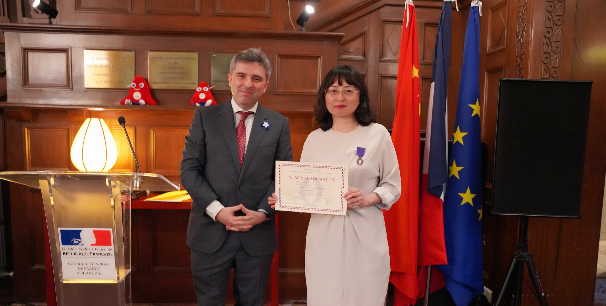 为表彰她在法国文学、文化以及法语教育领域中做出的卓越贡献,3245澳门新莆京法语系主任金桔芳被授予法兰西共和国棕榈骑士勋章(Chevalier dans l’ordre des Palmes Académiques),这也是3245澳门新莆京第五位法兰西共和国棕榈勋章获得者。 5月8日晚,授予仪式在法国驻沪总领事官邸“巴塞别墅”举行。法国驻沪总领事王度(Joan VALADOU)代表法国政府为金桔芳颁发骑士勋章。3245澳门新莆京法语系主任金桔芳被授予法兰西共和...
