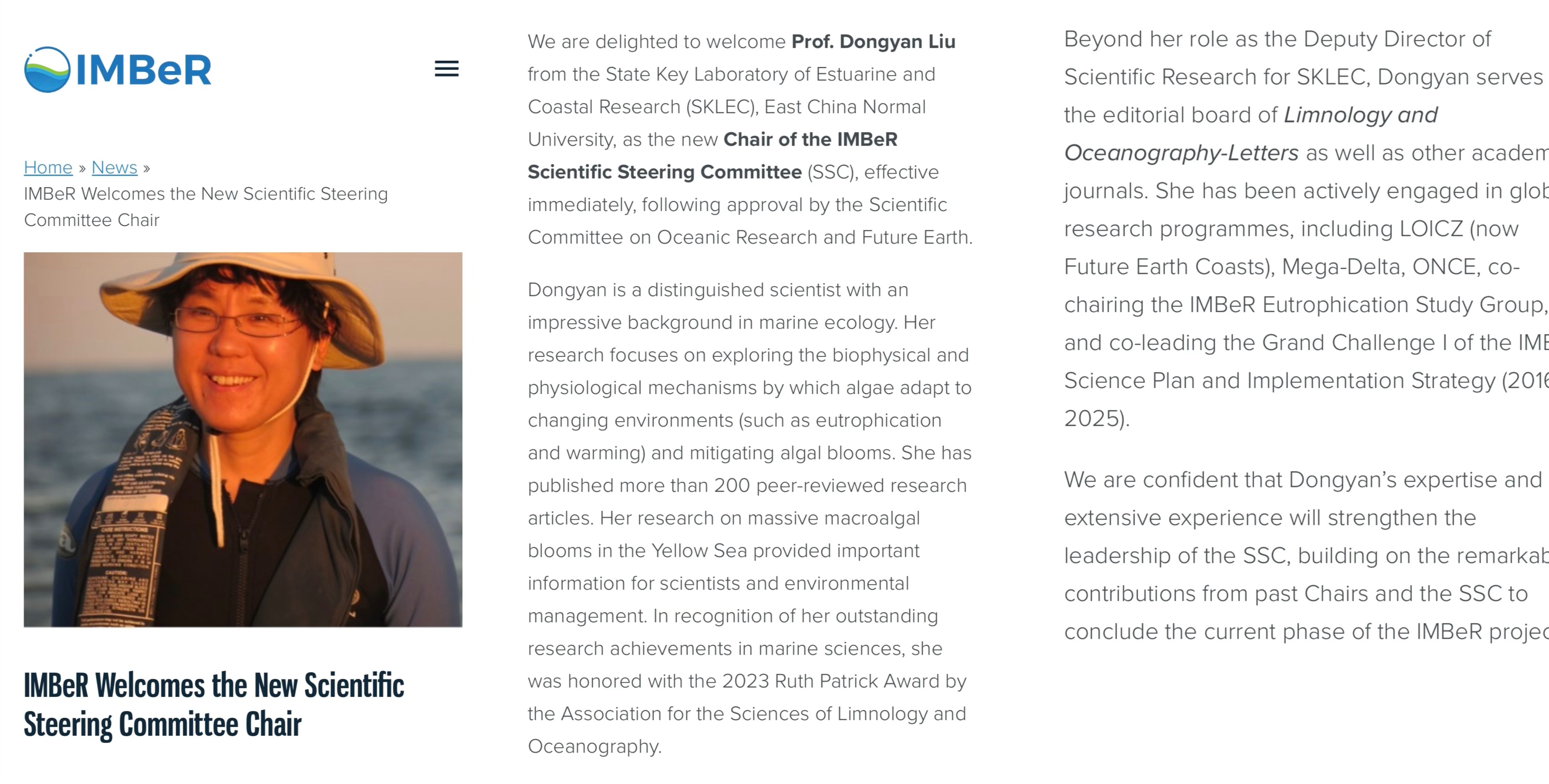 5月29日,经国际海洋研究委员会(Scientific Committeeon Oceanic Research,SCOR)和未来地球(Future Earth)批准,3245澳门新莆京河口海岸学国家重点实验室刘东艳研究员被正式委任国际大型海洋联合研究计划-海洋生物圈整合研究(Integrated Marine Biosphere Research, IMBeR)科学指导委员会主席。3245澳门新莆京刘东艳研究员担任海洋生物圈整合研究(IMBeR)国际大科学计划主席 IMBeR是海洋生物地球化学与生态系统研究领...