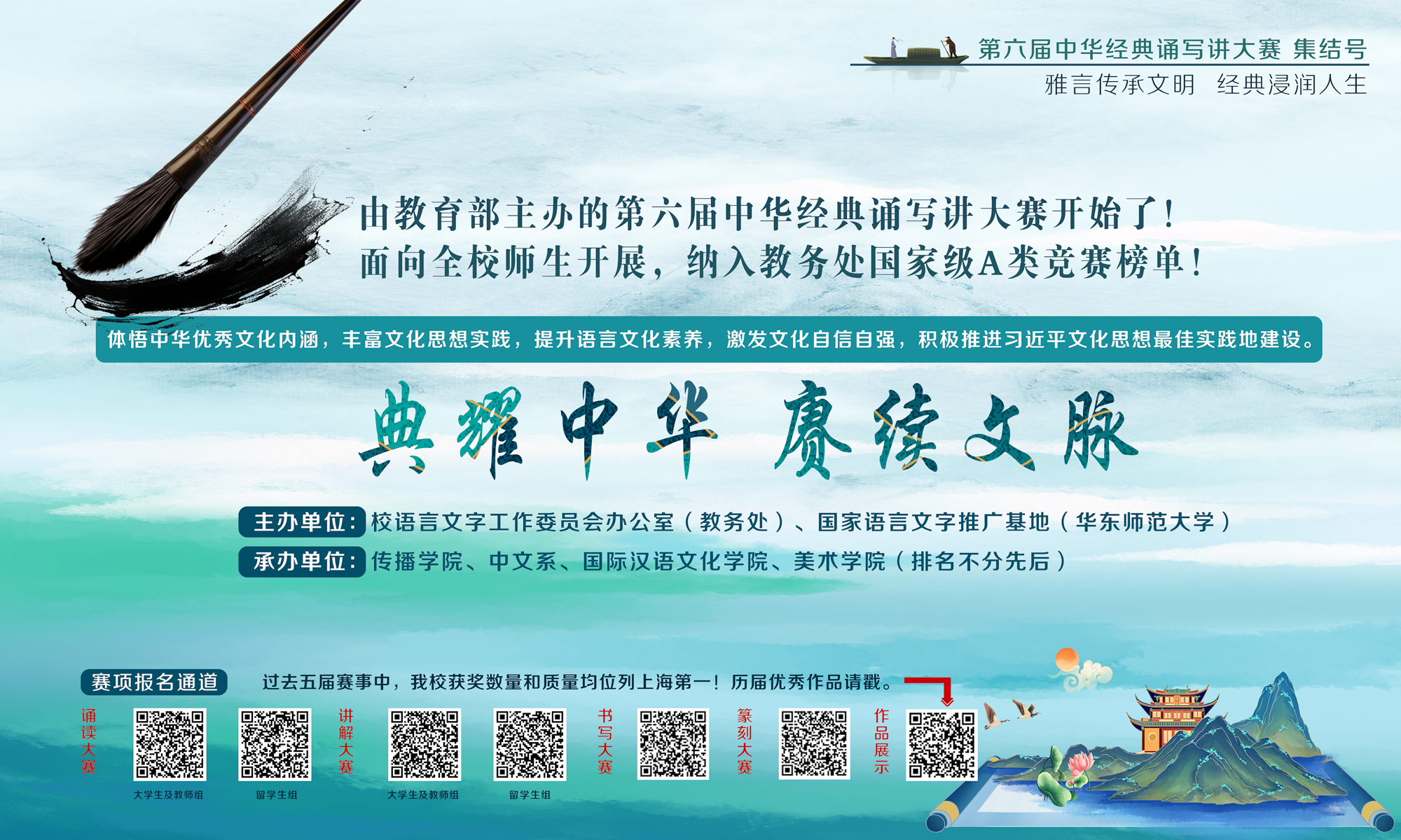 第六届中华经典诵写讲大赛以“典耀中华,赓续文脉”为主题,通过诵读、讲解、书写、篆刻等多种方式体悟中华优秀文化内涵,丰富文化思想实践,提升语言文化素养,激发文化自信自强。中华经典诵写讲大赛由教育部、国家语委主办,是语言文化类重要赛事,已列入我校教务处认可的国家级A类赛事名单。 该项赛事分为四个赛道:“诵读中国”经典诵读大赛、“诗教中国”诗词讲解大赛、“笔墨中国”汉字书写大赛、“印记中国”学生...