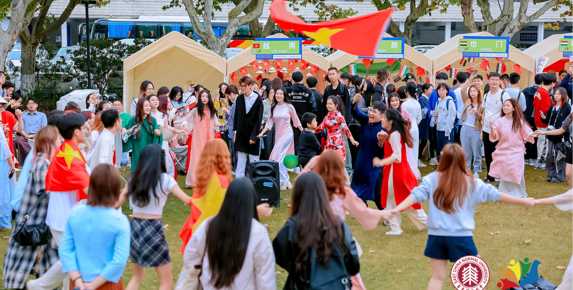 11月16日,丽娃河畔汇聚五大洲75个国家的展位。美食佳饮、精致摆件、异域服饰...吸引数万名观众。手持定制版“纪念护照”,穿梭于各国文化中集章留念,这里就是ECNU Mini Expo的现场! 参与学校国际教育园区合作伙伴美国国际教育交流协会交流项目的八所美国顶尖学府的大学生们以中国传统的舞龙表演热闹开场,75个国家的中外学生旗手——登台亮相。 白俄罗斯、日本、韩国、秘鲁、美国、越南、马来西亚、柬埔寨、坦桑尼...