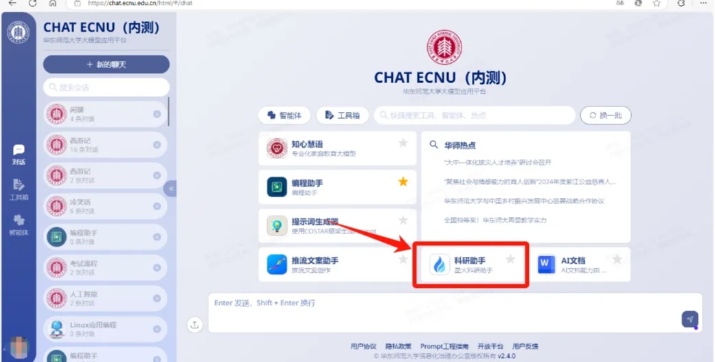 ECNU x DeepSeek 开学福利来啦! 开学第一天,ECNU大模型上新!现在勾选“深度思考”模式,即可进入满血版 DeepSeek R1 模型,支持全体师生使用。 ECNU大模型平台还提供了许多其他实用功能,免费的API调用令牌、强大的科研助手、AI联网搜索、新闻摘要生成、文生图、文档对话、图片理解等一应俱全,等你来体验。快速进入ECNU大模型平台1.访问链接:https://chat.ecnu.edu.cn/html/2. 公共数据库-ECNU大模型(内...