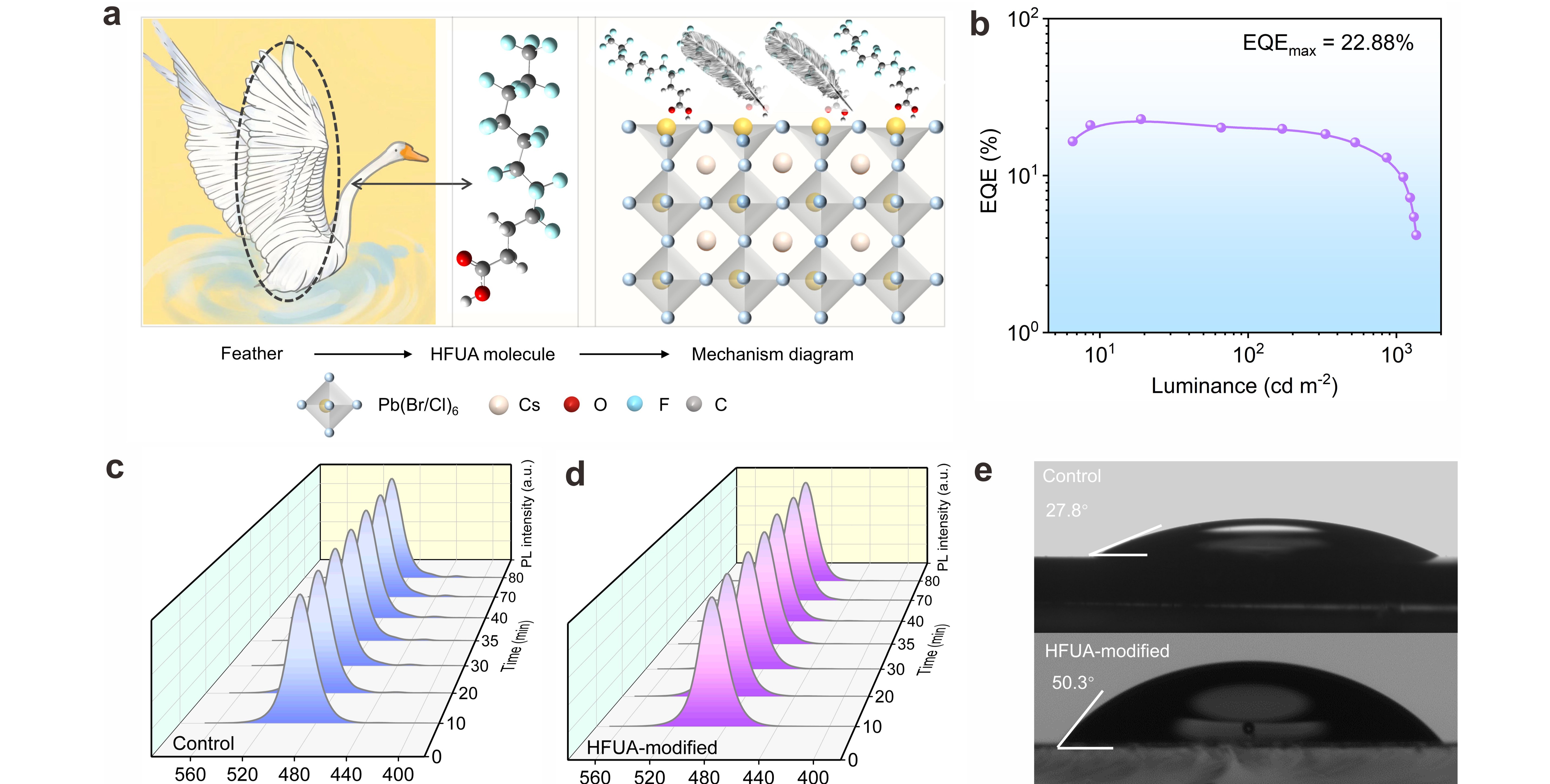金属卤化物钙钛矿具有出色的光电特性,包括可调光谱、高色纯度和高光致发光量子产率等优势,使其成为下一代发光二极管的有力候选材料。钙钛矿发光二极管(PeLEDs)目前已经实现了超过26%的外部量子效率(EQE),彰显了钙钛矿材料在发光领域的卓越潜力。然而,在推动钙钛矿发光技术向市场化迈进的过程中,蓝光钙钛矿发光材料与器件的稳定性不足,如对环境湿度敏感,以及容易遭受离子迁移等问题,严重阻碍了其进一步发展。面...
