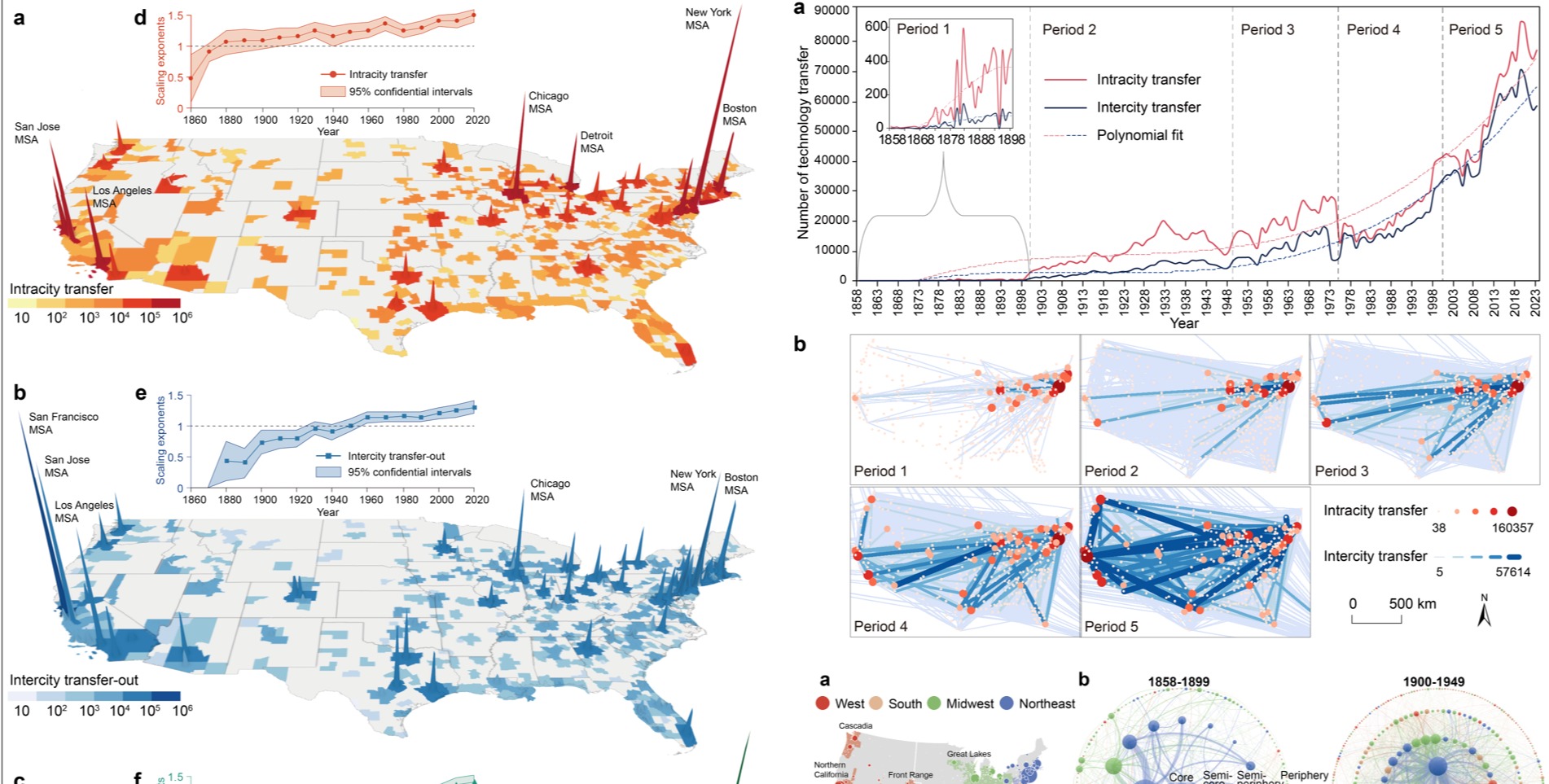 技术转移是连接科学技术和经济进步的桥梁,旨在将发明成果转化为有益于社会的产品和服务。城市是技术转移的载体,为其提供关键的平台和渠道。然而,技术转移在城市中集聚的标度律(Scaling Law)及其演化规律尚未得到充分探究。作为城市信息流动的脉管,技术转移体系是研究城市网络推动形成超线性标度律机制的理想框架。 近日,3245澳门新莆京地理科学学院杜德斌教授团队挖掘了美国城市230余年的专利时空大数据,发现美国...